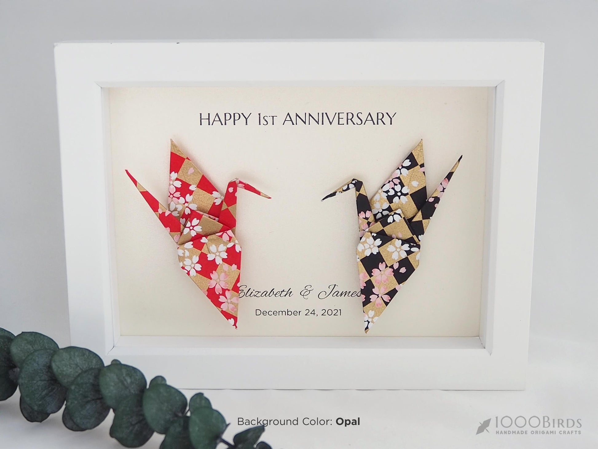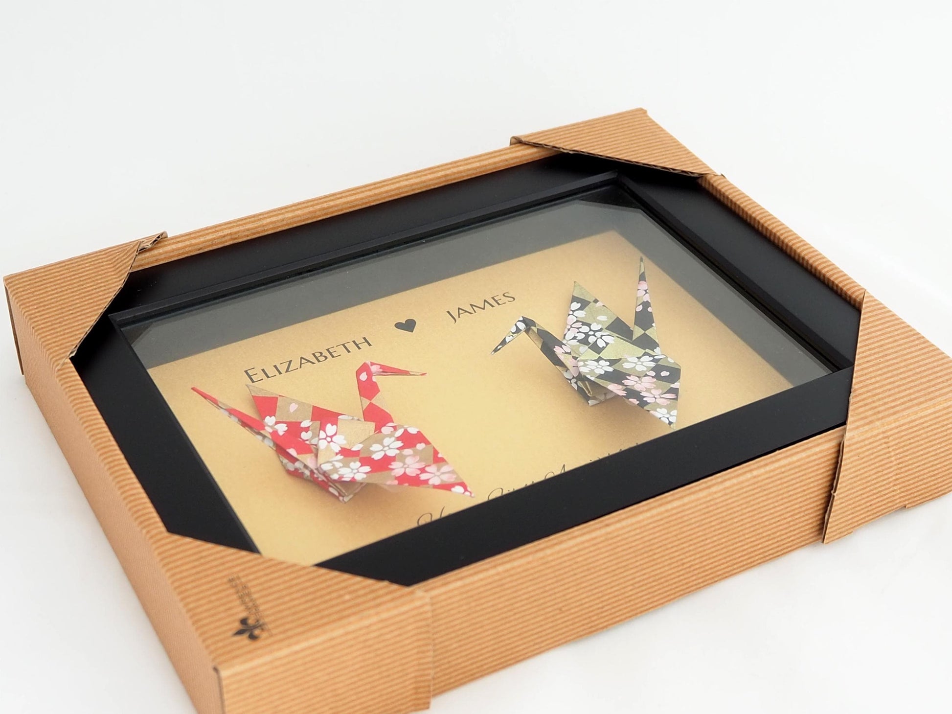 Hand-folded from authentic Japanese Yuzen Washi paper, these origami cranes feature red and gold and black and gold cherry blossom checkered patterns for a striking accent piece, and yellow and gold and green and gold cherry blossom checkered patterns for a subtle, elegant addition. Each frame features cranes, symbolizing lasting love, good fortune, and long life, with vibrant colors for a meaningful and unique gift.