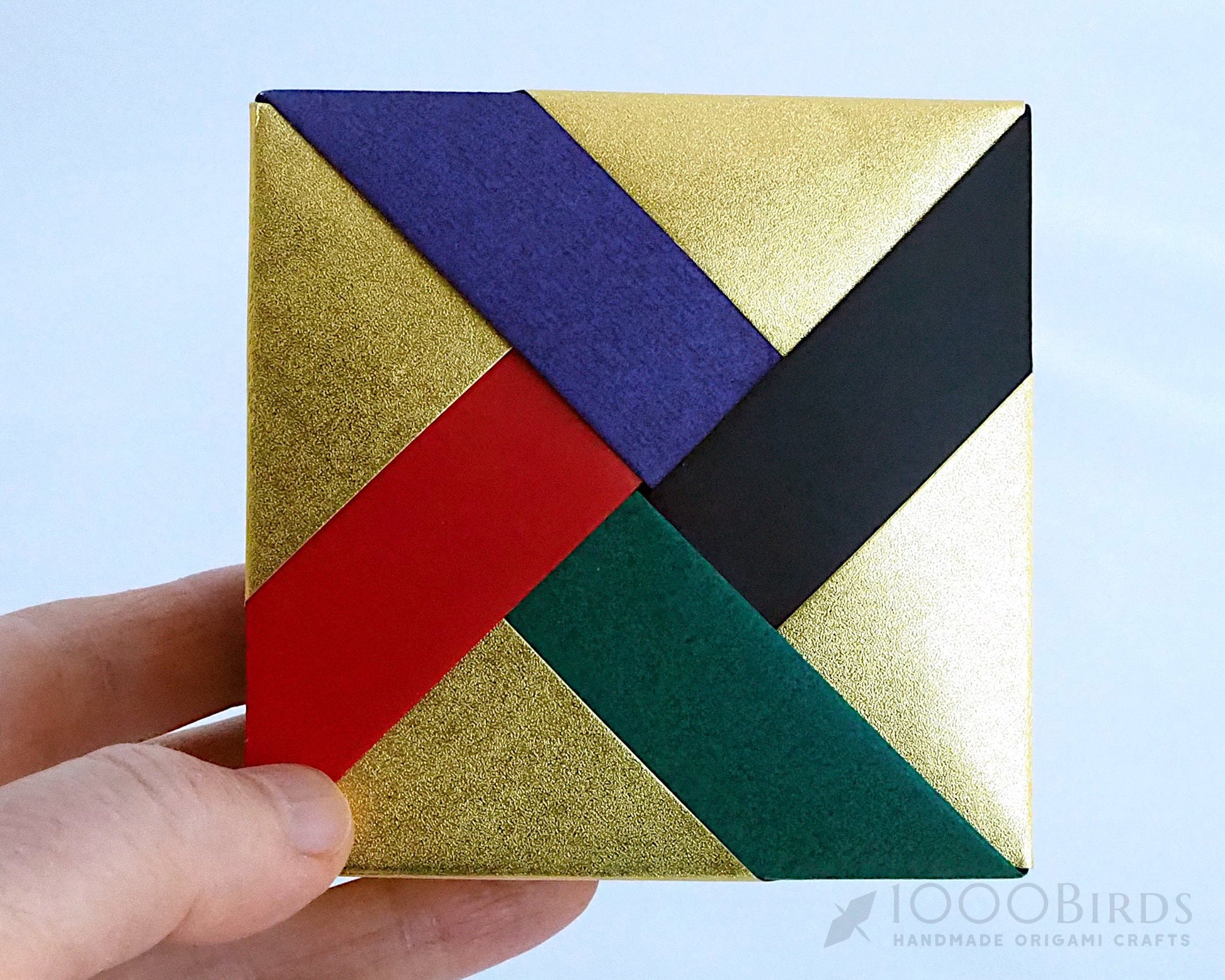 The lids of our Chevron Pattern Origami Square Box are made by folding four pieces of vibrant matte gold two-sided Origami paper. For the bottom tray, we use high-quality black Tant Origami paper, folded into four modular pieces. A touch of glue is applied to secure its shape, ensuring the box remains sturdy and elegant.