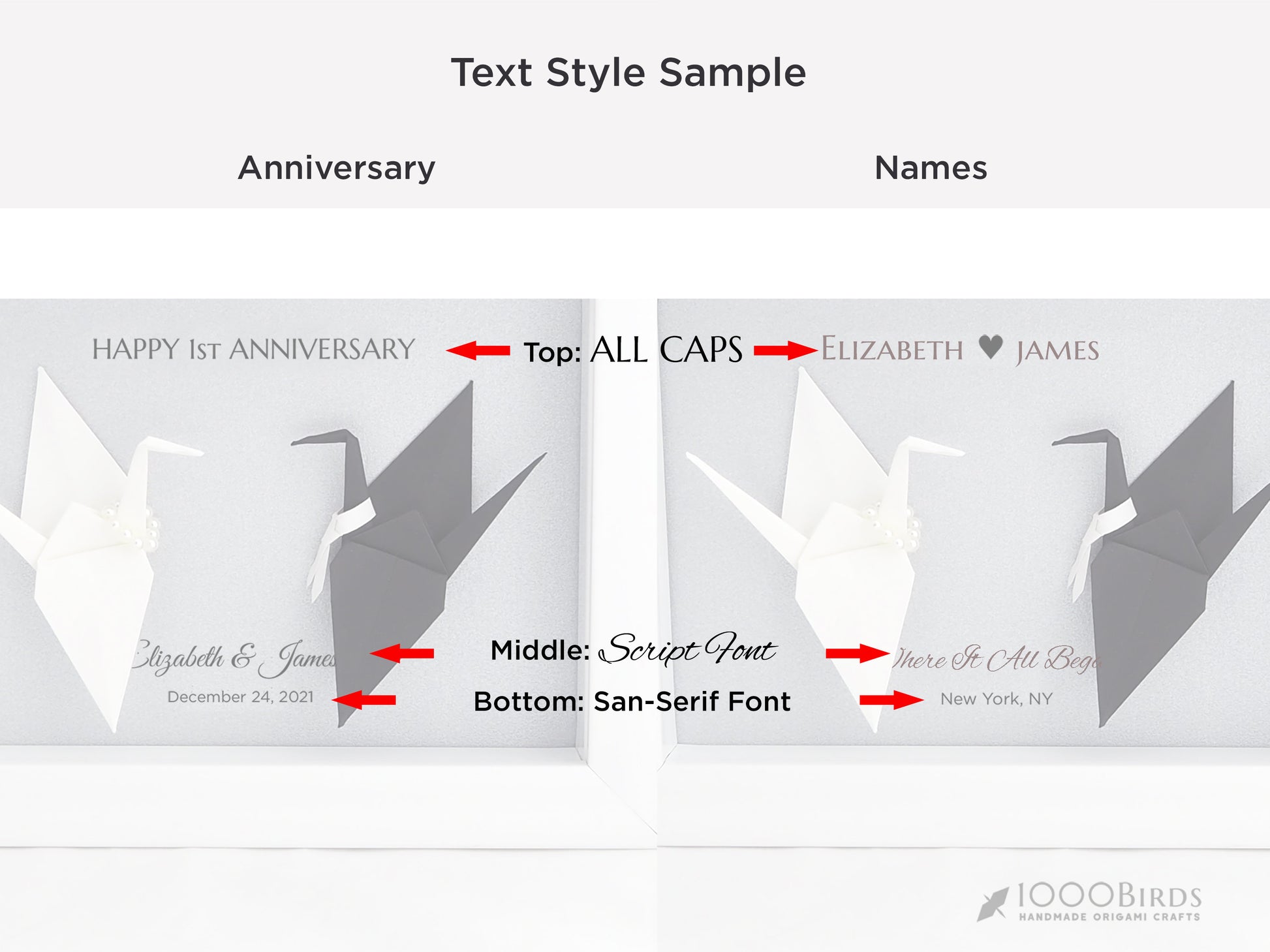 Celebrate your love with this Personalized Origami Wedding Frame featuring hand-folded cranes and two special paper flower bouquet options. Choose between a sample bouquet for a classic look or a custom bouquet designed to match your wedding flowers. Each crane is crafted from authentic Japanese Origami paper—the bride’s crane with a faux pearl necklace, and the groom’s with a tie or bowtie. Perfect for your 1st Anniversary (Paper Anniversary) or any milestone, this unique keepsake symbolizes good fortune and longevity.
