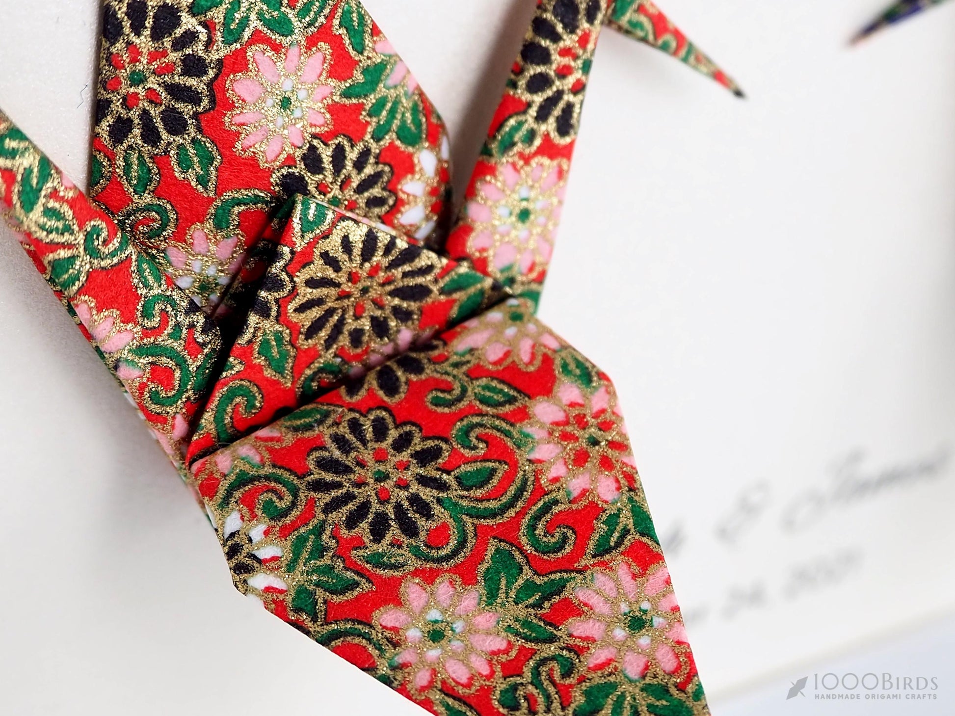 Celebrate love with our framed Origami Crane art, featuring vibrant floral patterns and luxurious gold detailing. This unique, handcrafted piece displays two cranes facing each other on rich Vermilion and Navy Yuzen Washi backgrounds, symbolizing connection and harmony. The color combination is absolutely gorgeous, creating an eye-catching addition to any decor. Perfect as a personalized anniversary gift, wedding present, or meaningful keepsake, this crane art adds a touch of elegance to your home while beautifully telling your love story.