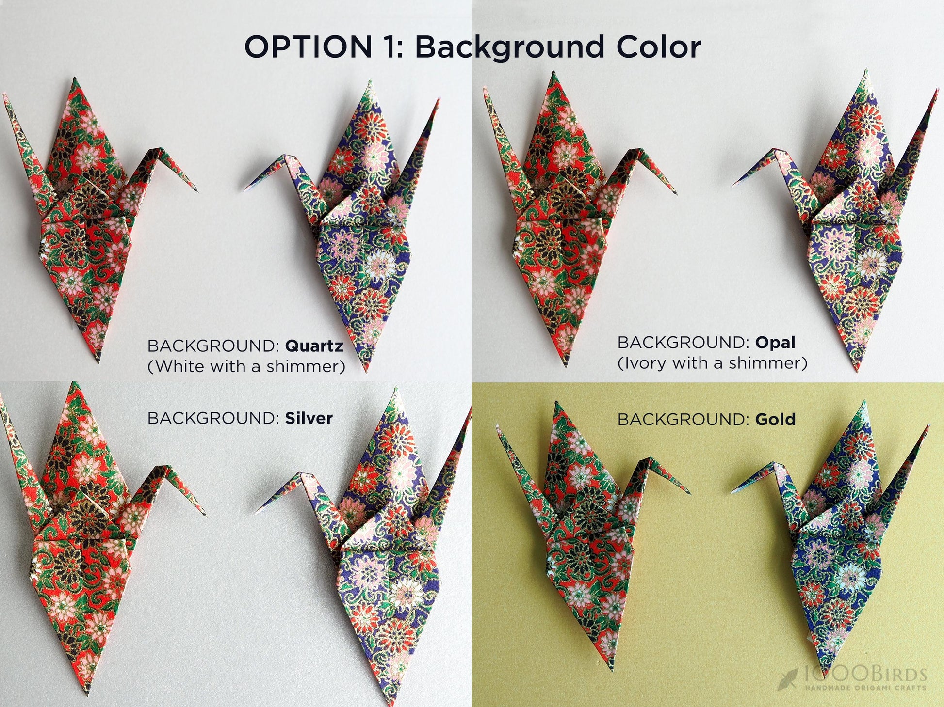• Each origami crane is hand-folded from high-quality silk-printed Japanese Washi paper. The cranes are mounted on heavy metallic-textured, acid-free craft paper.
