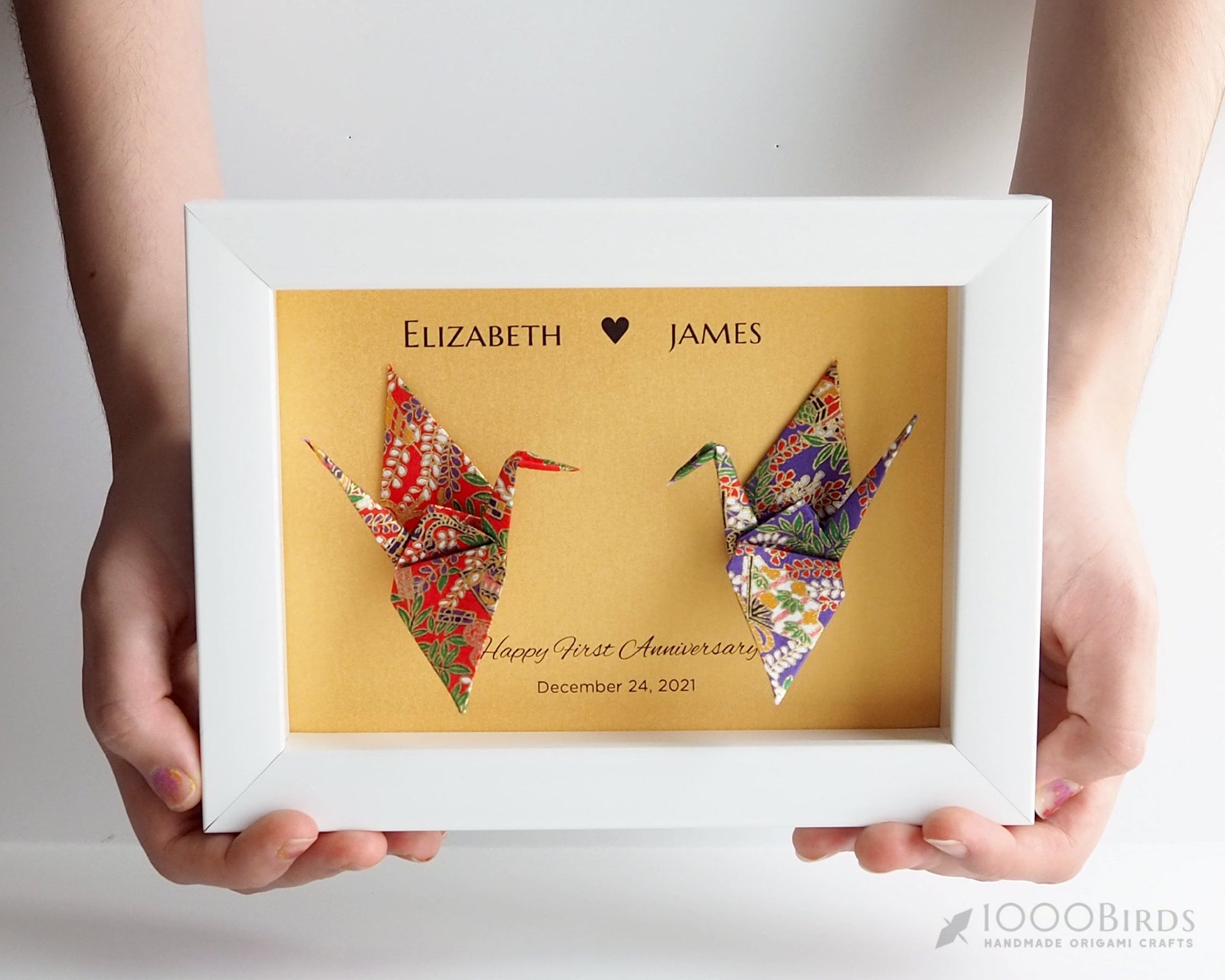 The Origami cranes are folded by me from high-quality Hand-printed Japanese Washi Origami paper imported from Japan, then they are attached to the heavy textured Acid-free craft paper.