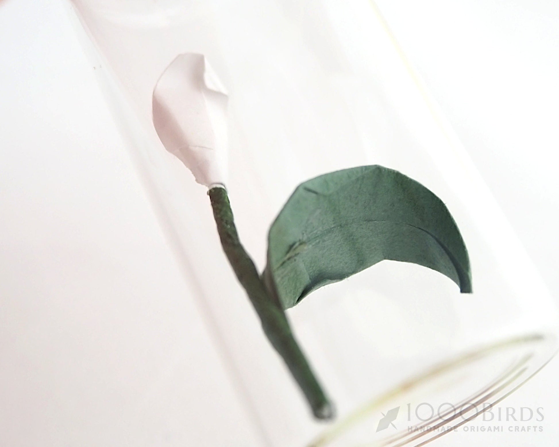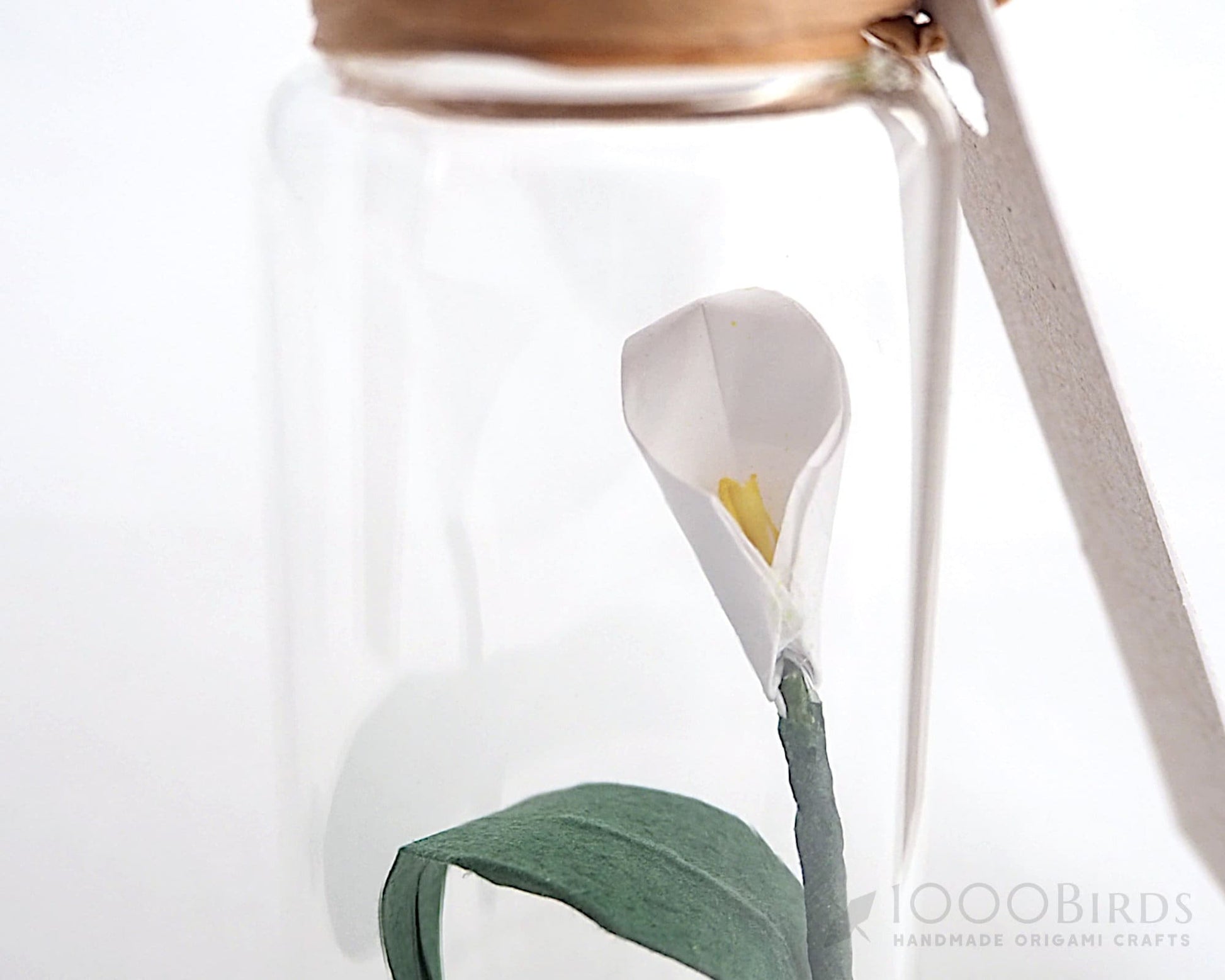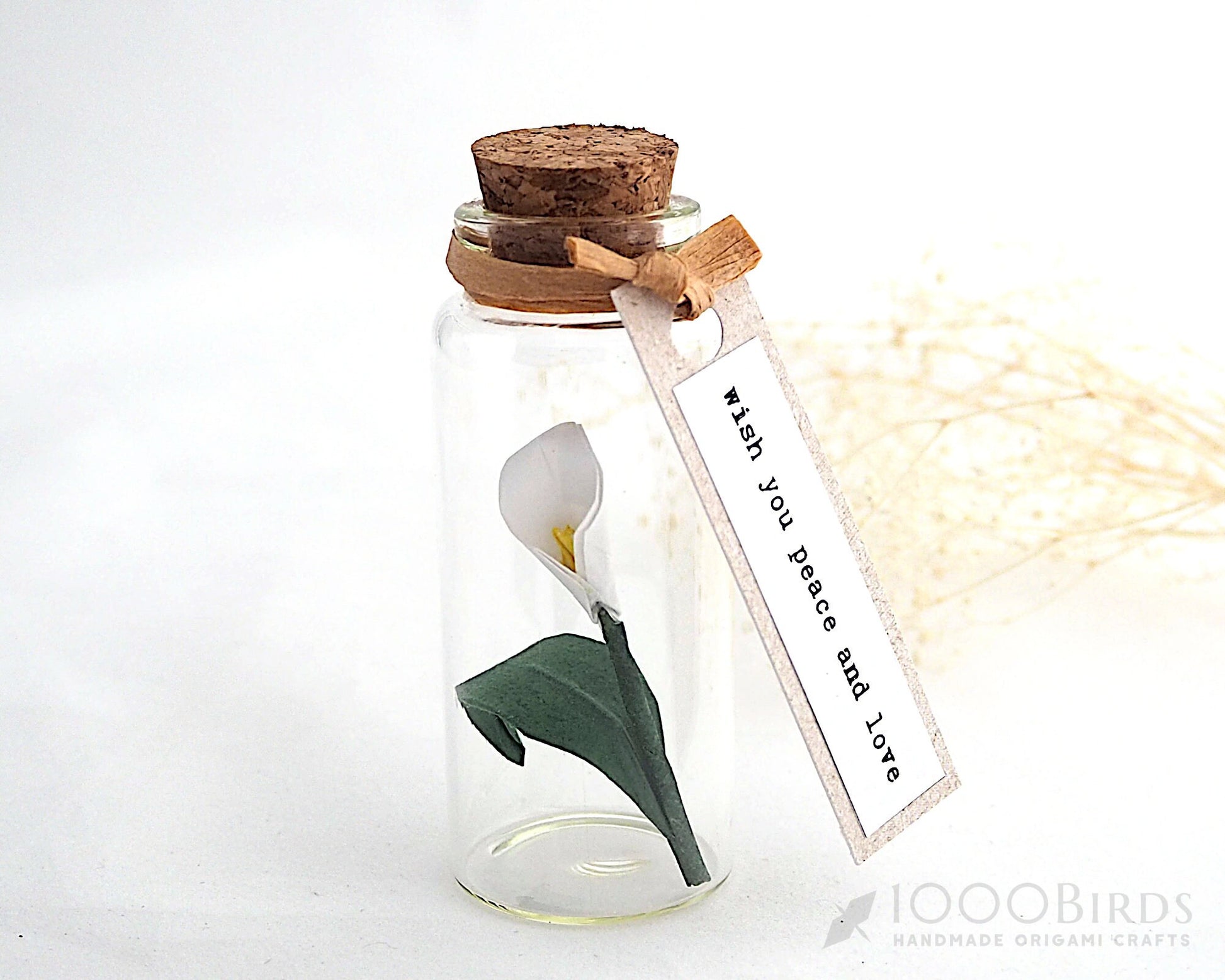 This beautiful tiny Origami Peace Lily (Calla Lily) in a mini bottle would make a very special tender gift. While a peace lily can often be sent as a sympathy flower, this stunning flower symbolize many things, as they usually wish you peace and love. It is sure to delight everyone who receives this bottle.