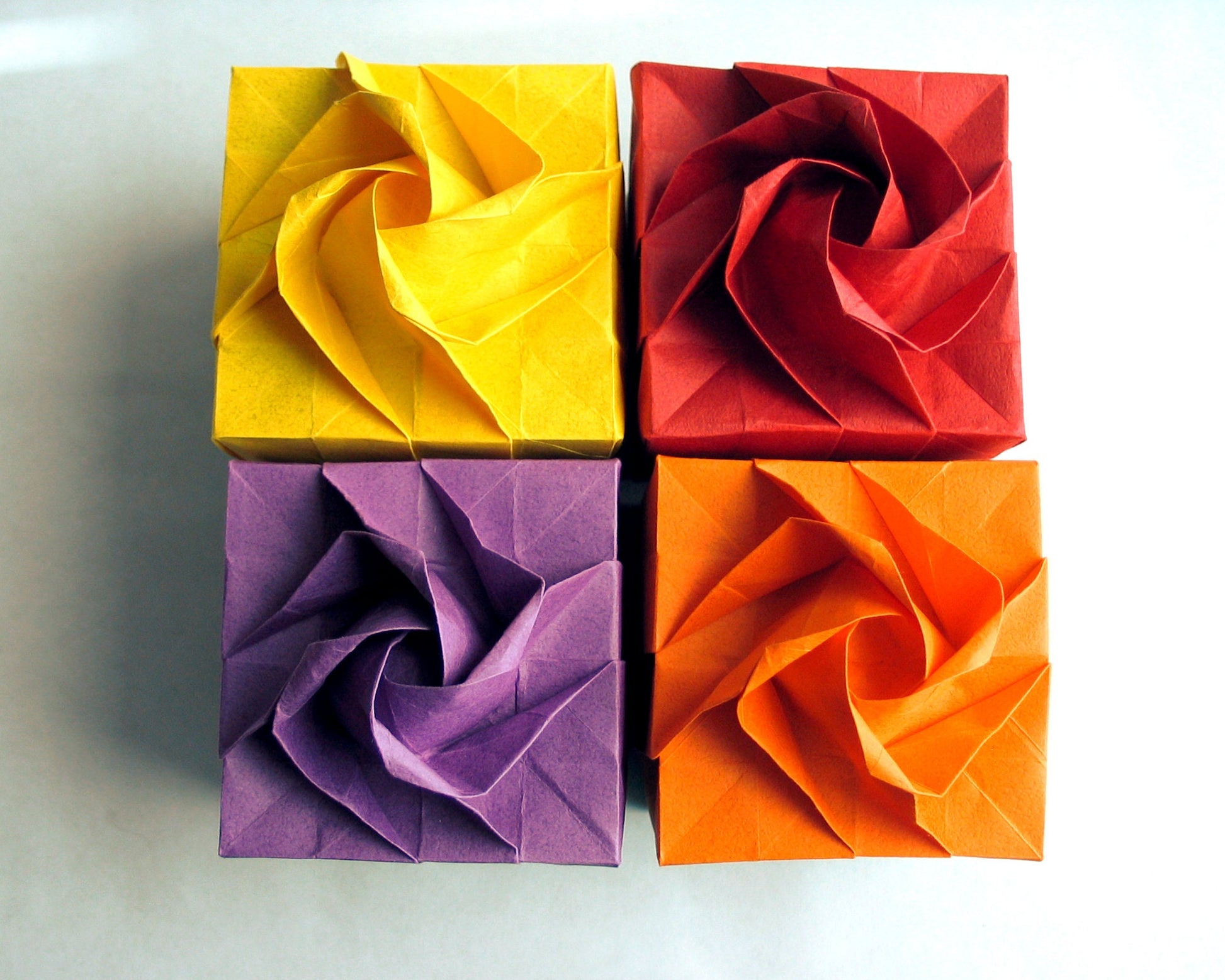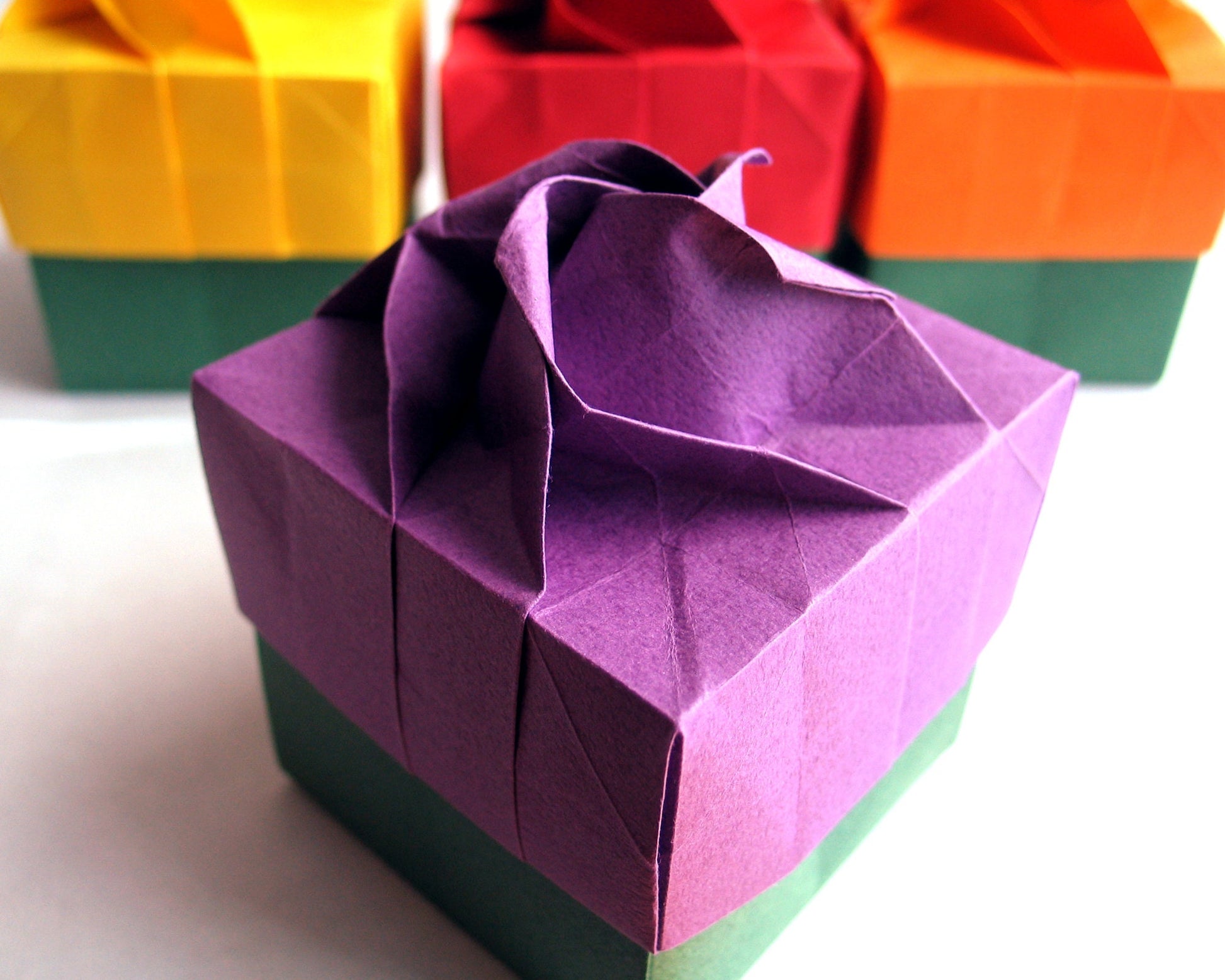 Handcrafted rose origami boxes, a unique design of rose as part of the lid. All hand-made by me with traditional Japanese Origami techniques, made of high-quality TANT origami paper imported from Japan. It has deep and brilliant colors on both sides, a slight crepe texture to it, and heavier than regular origami paper, it produces a material with strength, durability, and flexibility.
