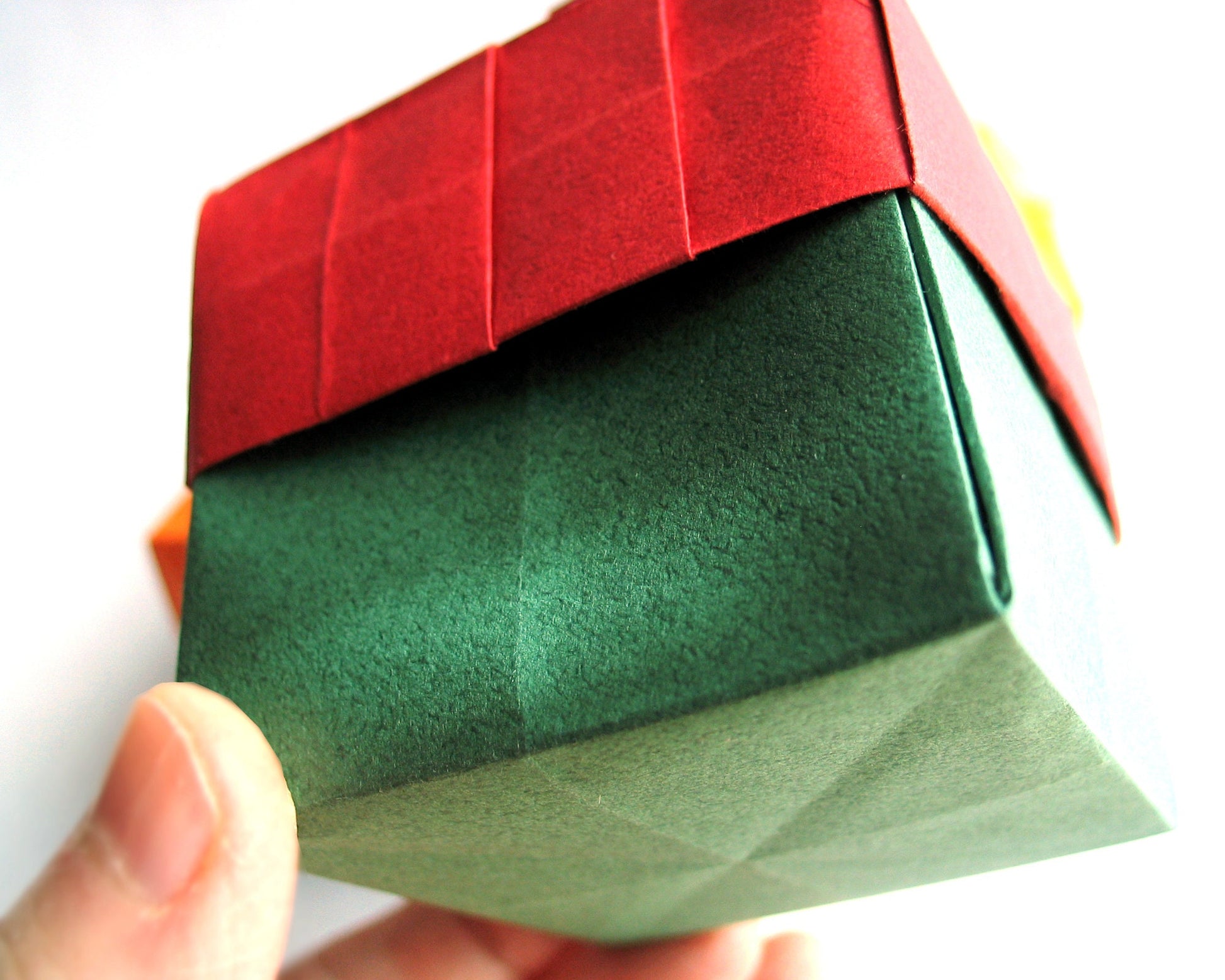 The boxes are folded by me with traditional Japanese Origami techniques without glue, tape, or scissors from authentic Japanese Tant Origami paper. A light glue is applied to the bottom box for stabilization.