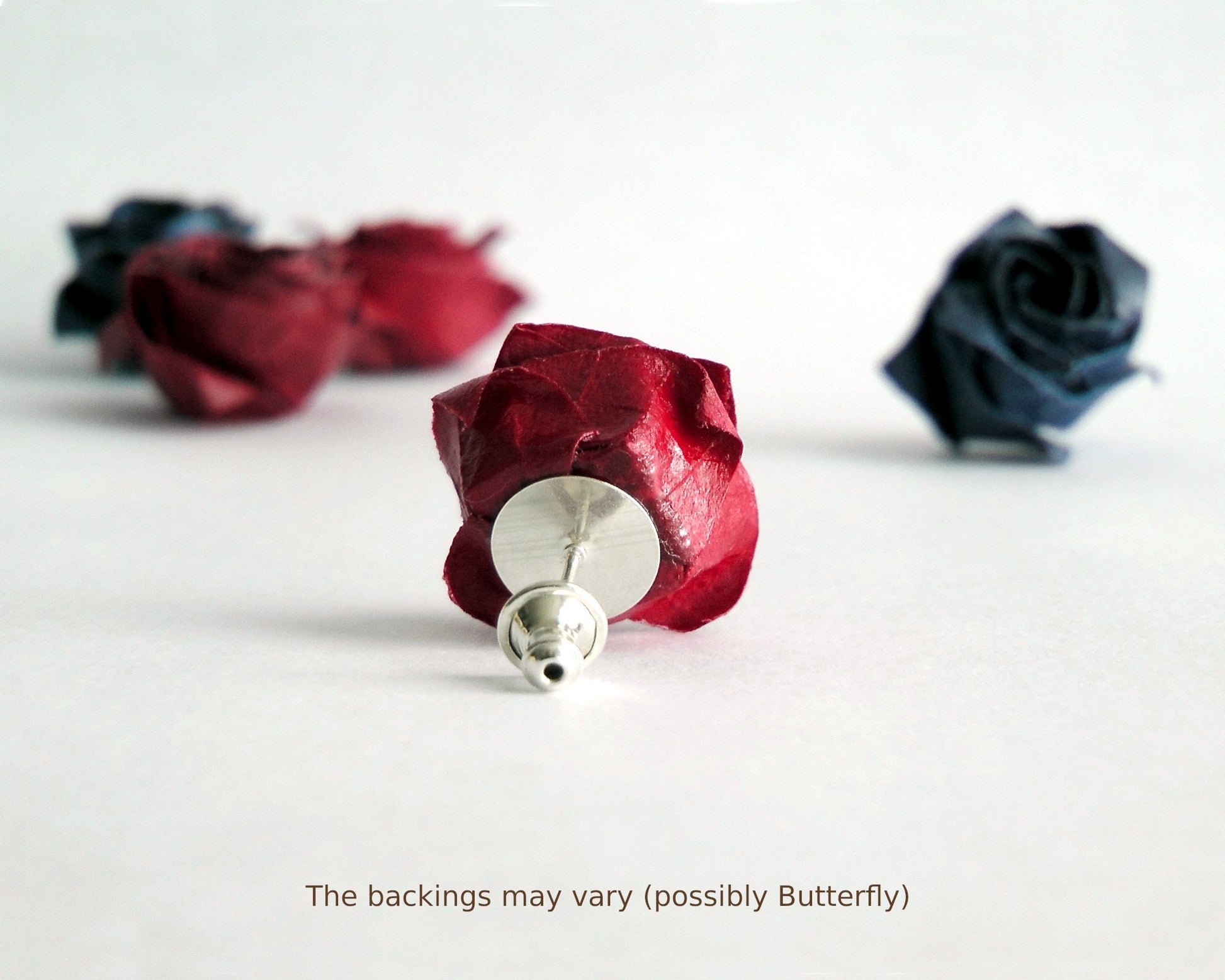 The rose head is folded by me with traditional Japanese Origami techniques without glue, tape, or scissors from a tiny square Origami paper. Each earring is coated with a non-toxic sealant for durability. Then, the jeweler's adhesive was used to secure the rose onto the stud.