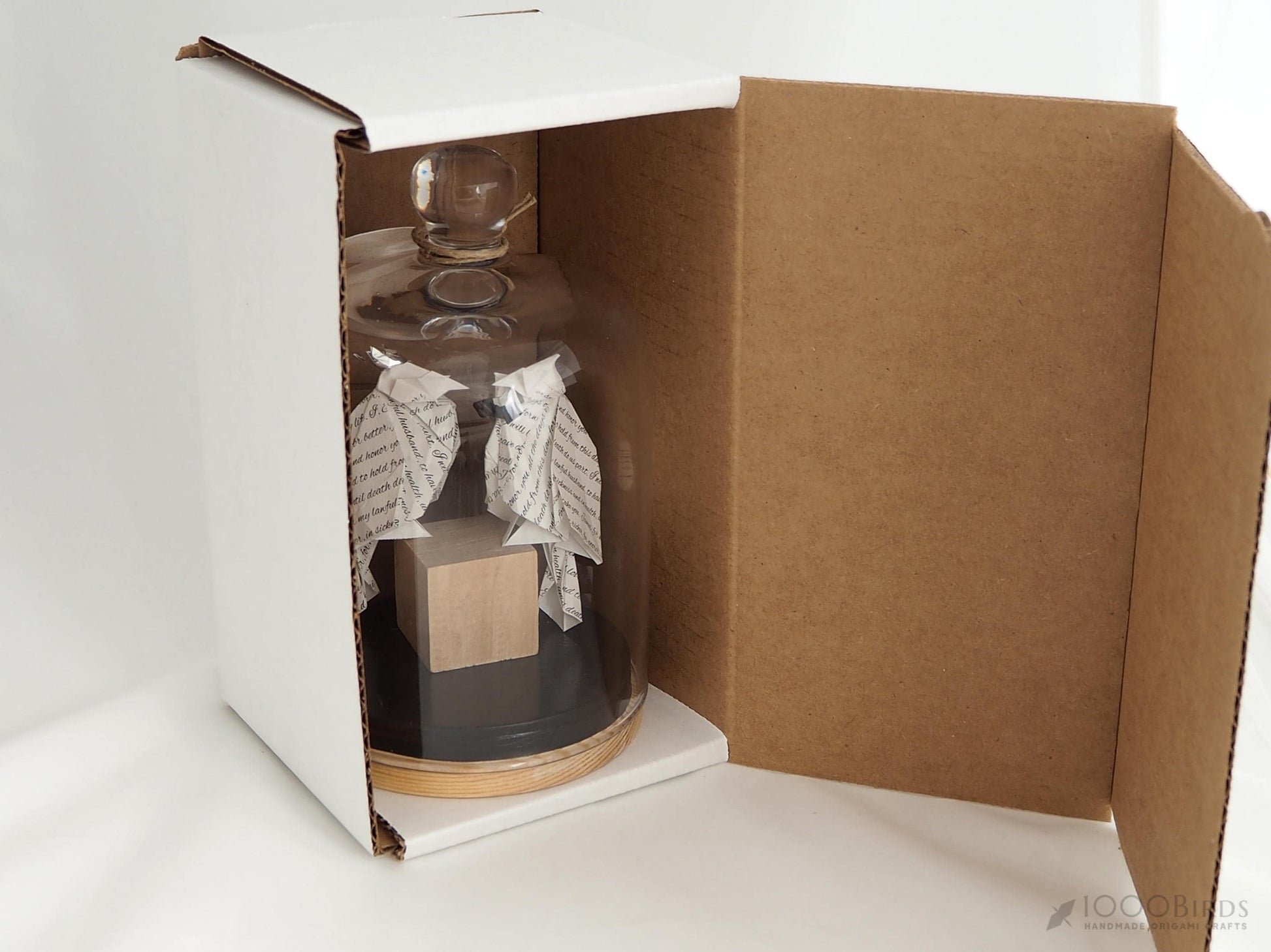 Your personalized origami cardinal couple will be delivered in a glass cloche, securely packaged in a white mailer for protection. It will be carefully placed in a mailing box with bubble wrap for added safety. The package will be shipped via USPS First Class Parcel Mail, and you will receive a tracking number for your order.