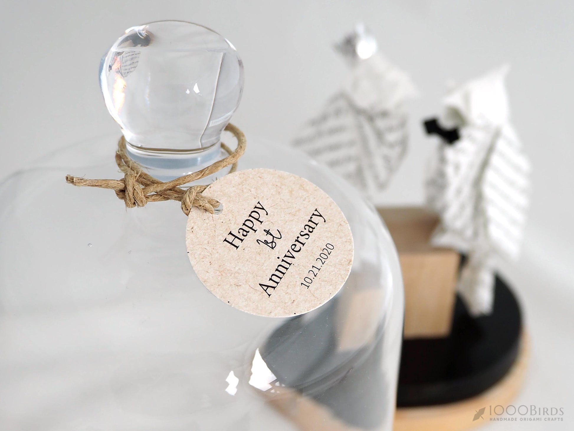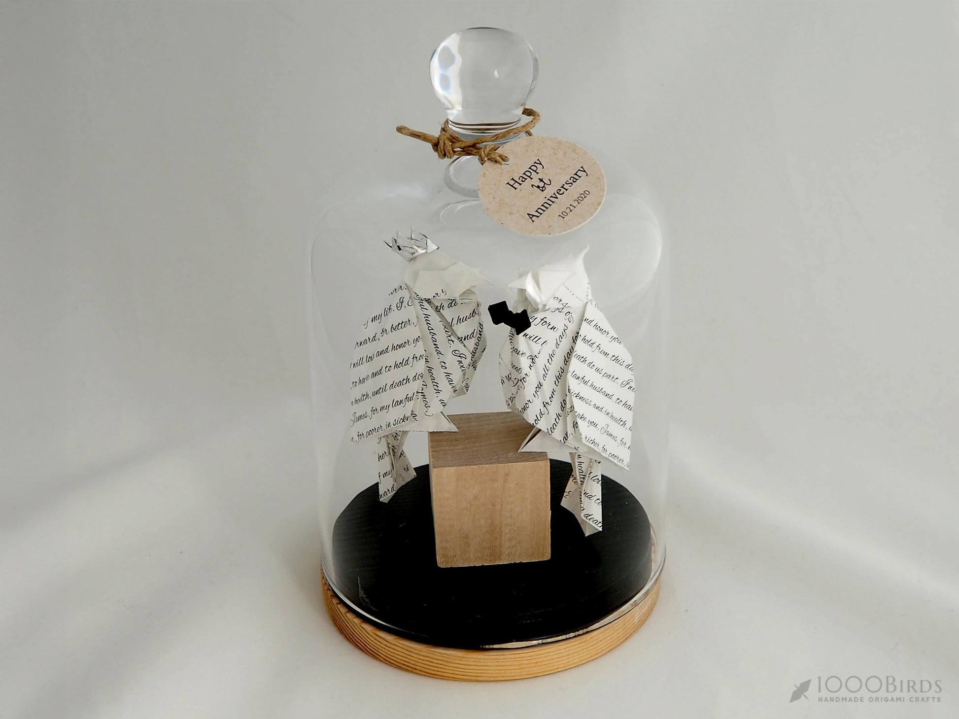 Honor your first wedding anniversary with our personalized Origami Cardinal Sculpture, crafted from premium Japanese Tant Origami paper. This elegant piece features a groom's vow on a male cardinal and a bride's vow on a female cardinal, symbolizing enduring love. Encased in a glass cloche atop a solid wood base, it serves as a memorable keepsake and charming décor.