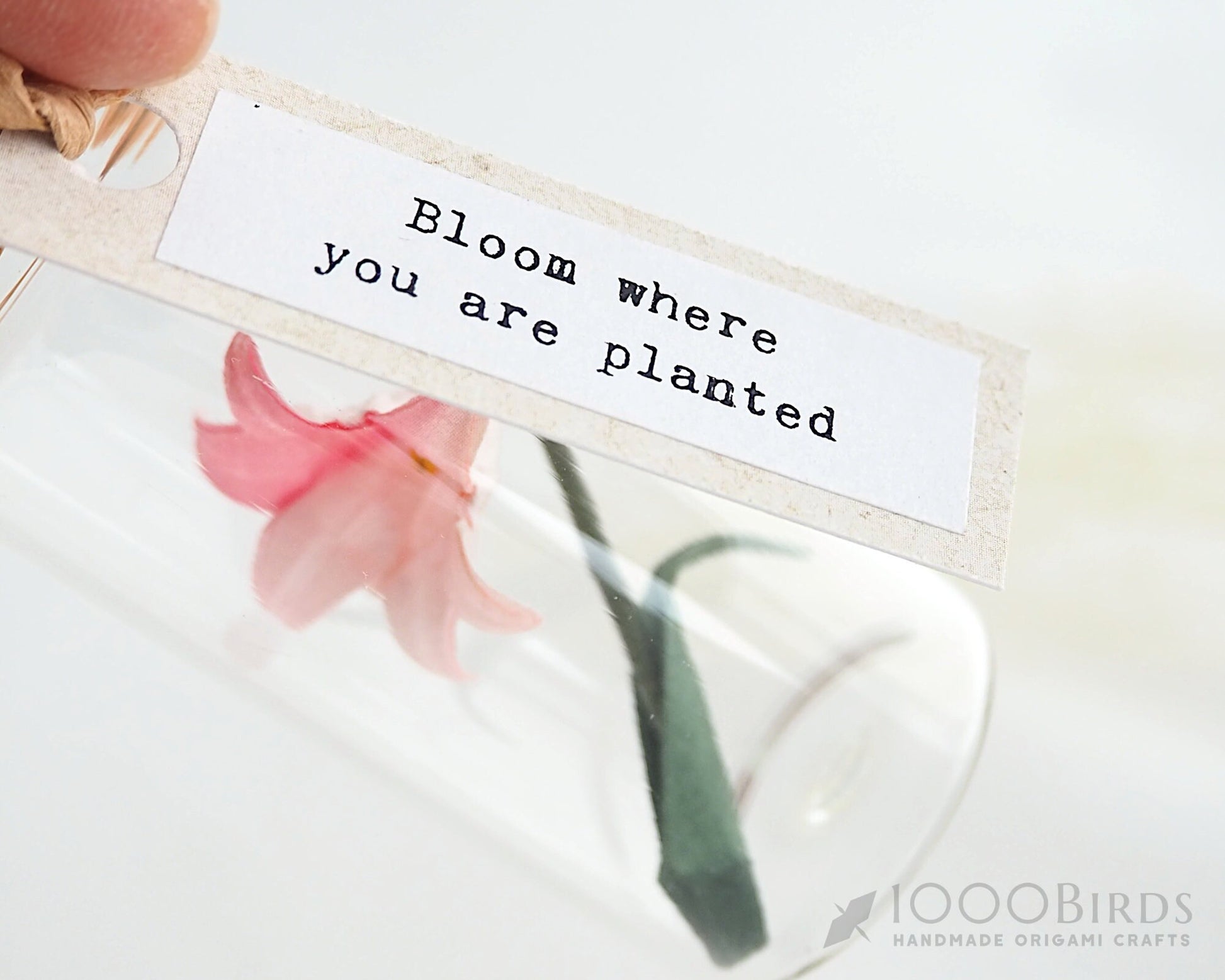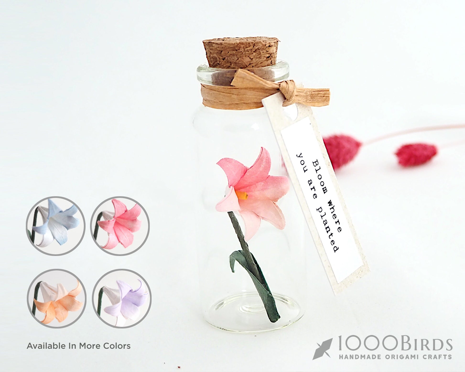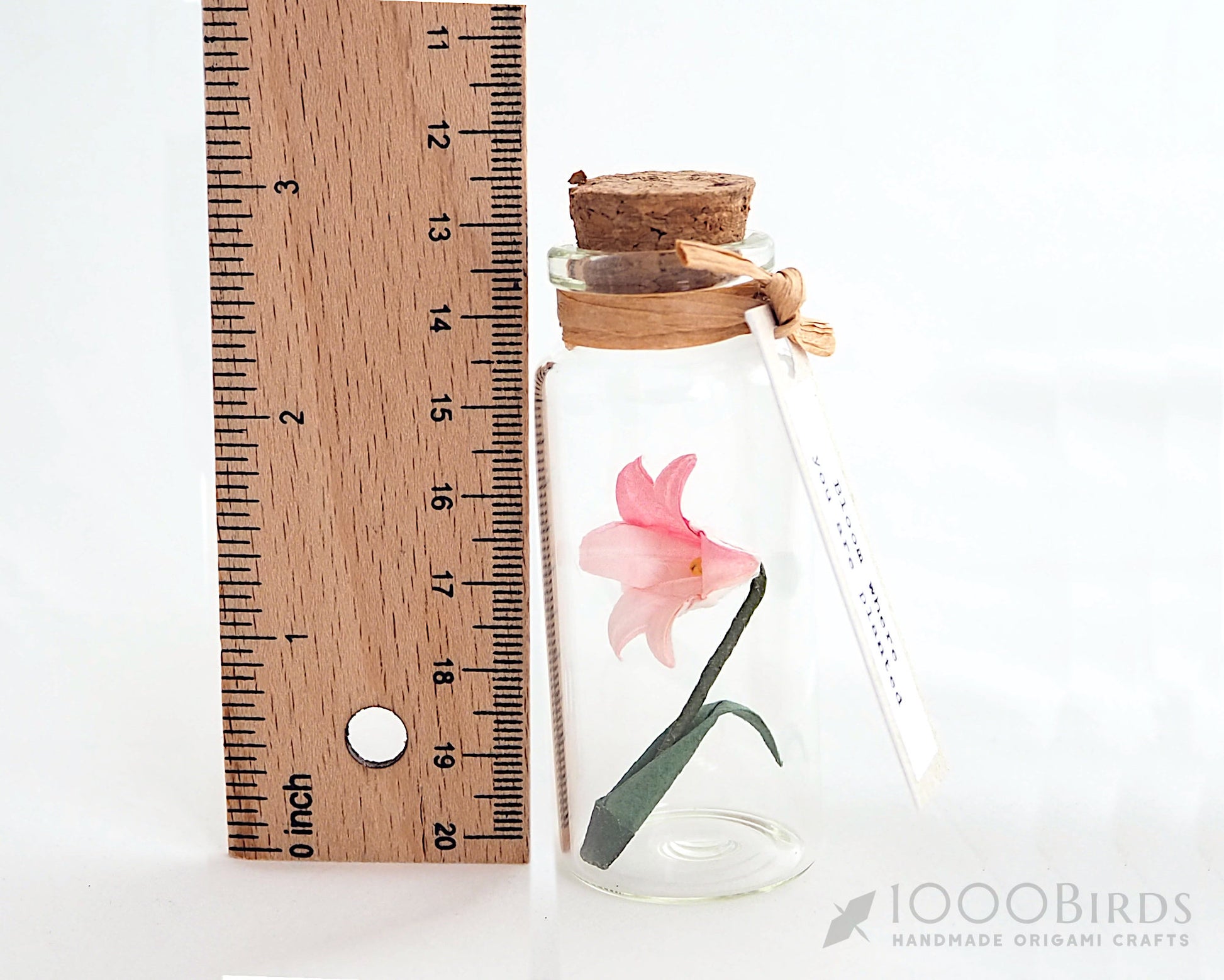 Pink Japanese Washi Origami Paper Lily in Mini Bottle with Personalized Tag for Graduation Gift, Remembrance Gifts