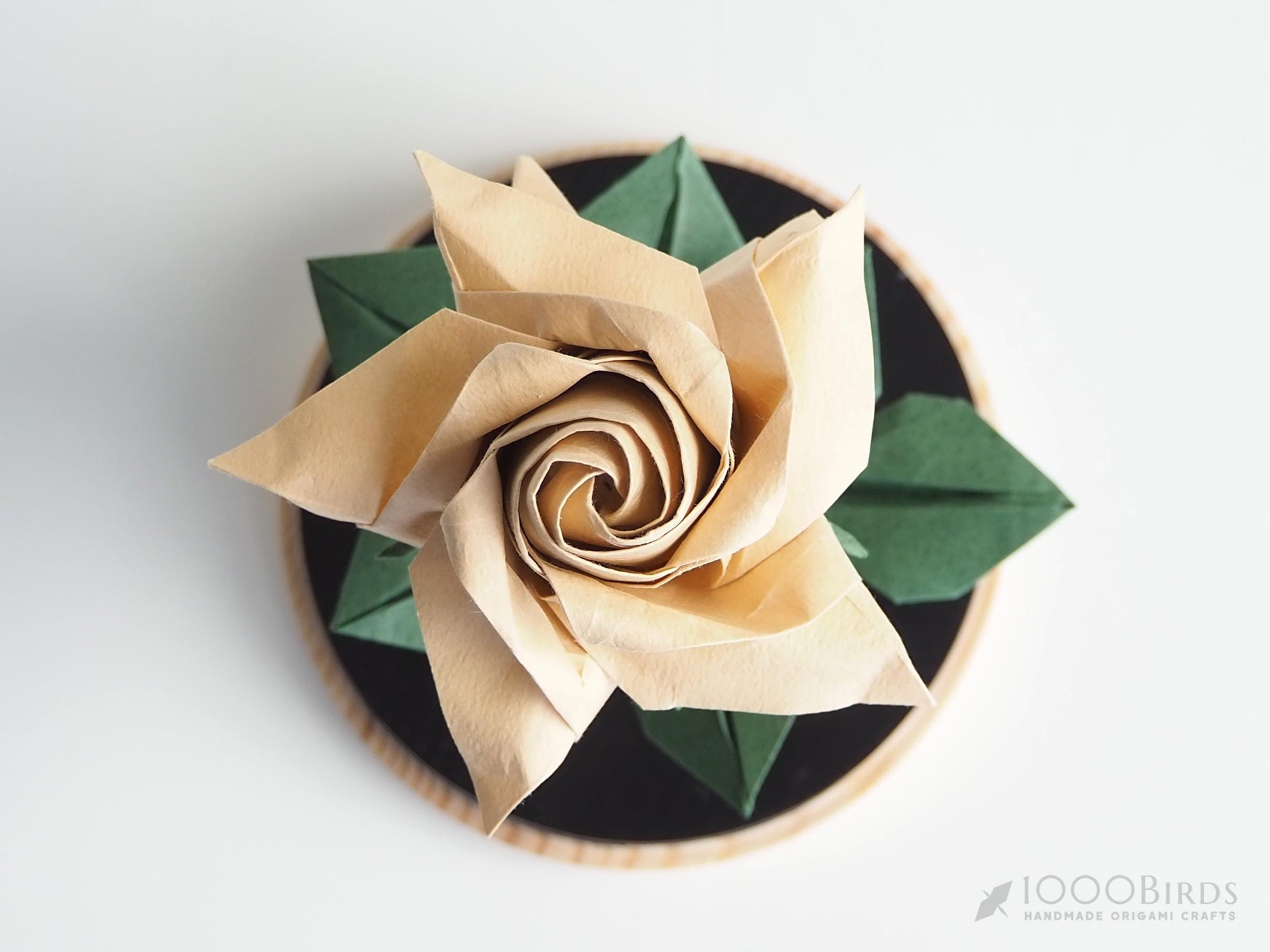 Inspired by the Pentagon Rose and Kawasaki’s Rose, each rose, calyx, and leaf is hand-folded, assembled with floral wire and tape, and secured with glue onto a wooden base.
