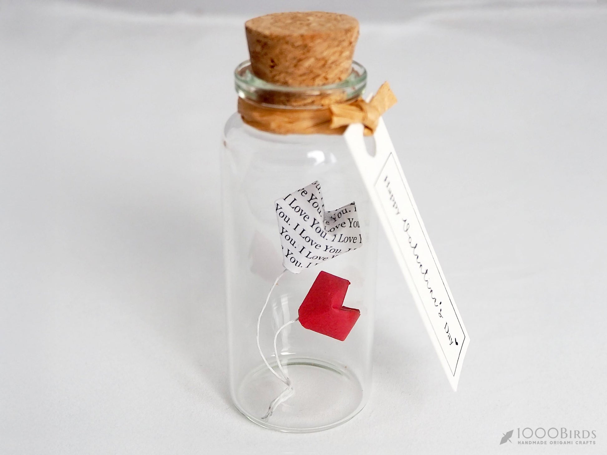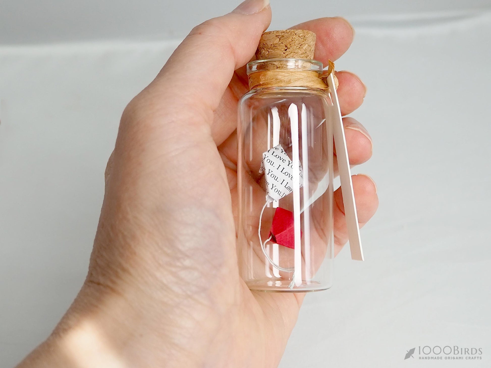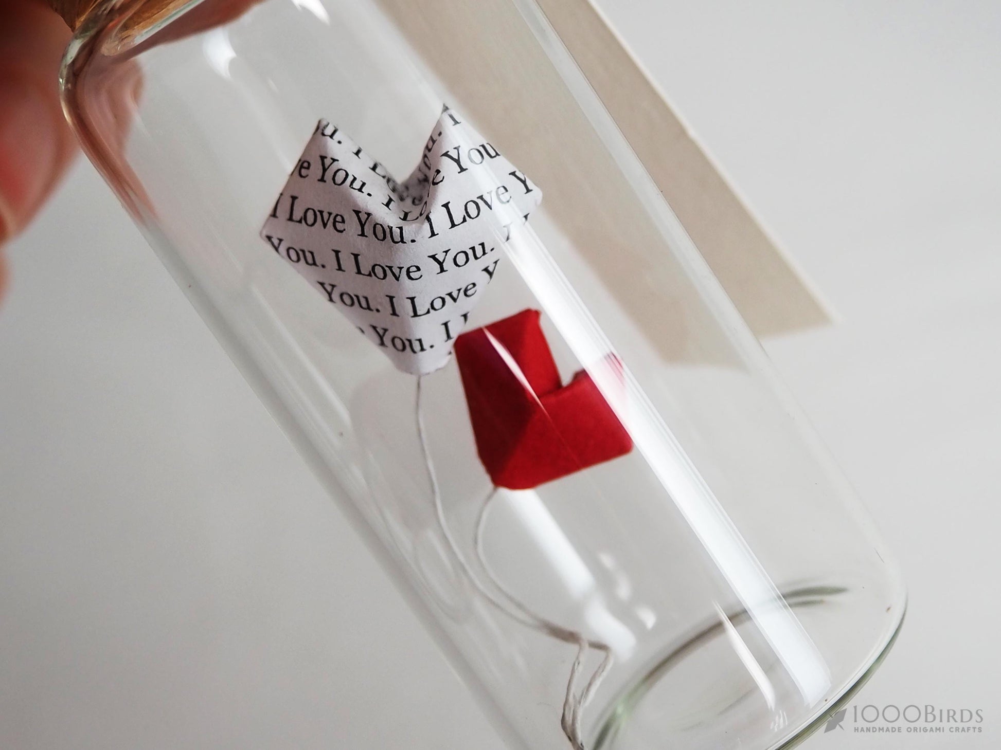 Celebrate your special moments with this mini glass bottle featuring two hand-folded Origami heart balloons—one in a bold solid red and the other with a customizable text option. This unique keepsake is the perfect gift for Valentine's Day, First (Paper) Anniversary, or any milestone between two people.